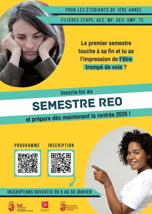 S'adressant aux étudiants de 1ère année de l'IUT du Creusot et du Centre Universitaire Condorcet, le semestre REO est un semestre alternatif allant de février à mai. Son but : aider ceux qui souhaitent quitter leur formation à repartir sur de bonnes bases l'an suivant.